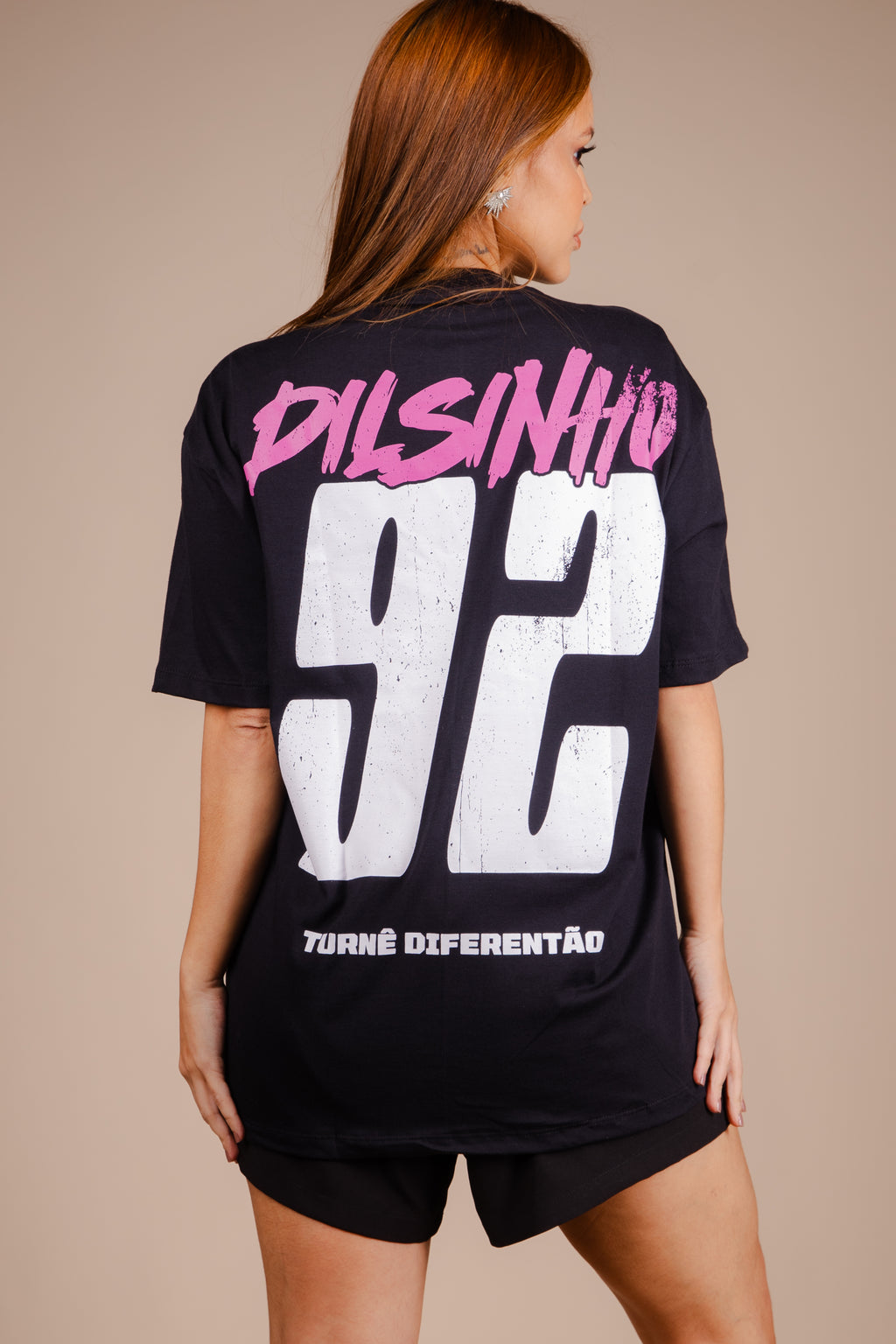 Camiseta oversized preta confeccionada em algodão de alta qualidade, com modelagem ampla e caimento confortável. O destaque fica por conta da estampa frontal com o rosto estilizado de Dilsinho, em tons vibrantes de roxo e rosa, transmitindo toda a irreverência e carisma do artista. Na parte de trás, a camiseta traz a inscrição “DILSINHO 92 – Turnê Diferentão”, em uma combinação marcante de letras brancas e rosa neon, que reforça o conceito jovem, moderno e autêntico da coleção. Essa peça é perfeita para quem quer expressar atitude e estilo enquanto celebra um dos momentos mais icônicos da carreira de Dilsinho. Ideal para compor looks casuais ou para usar nos shows da turnê!